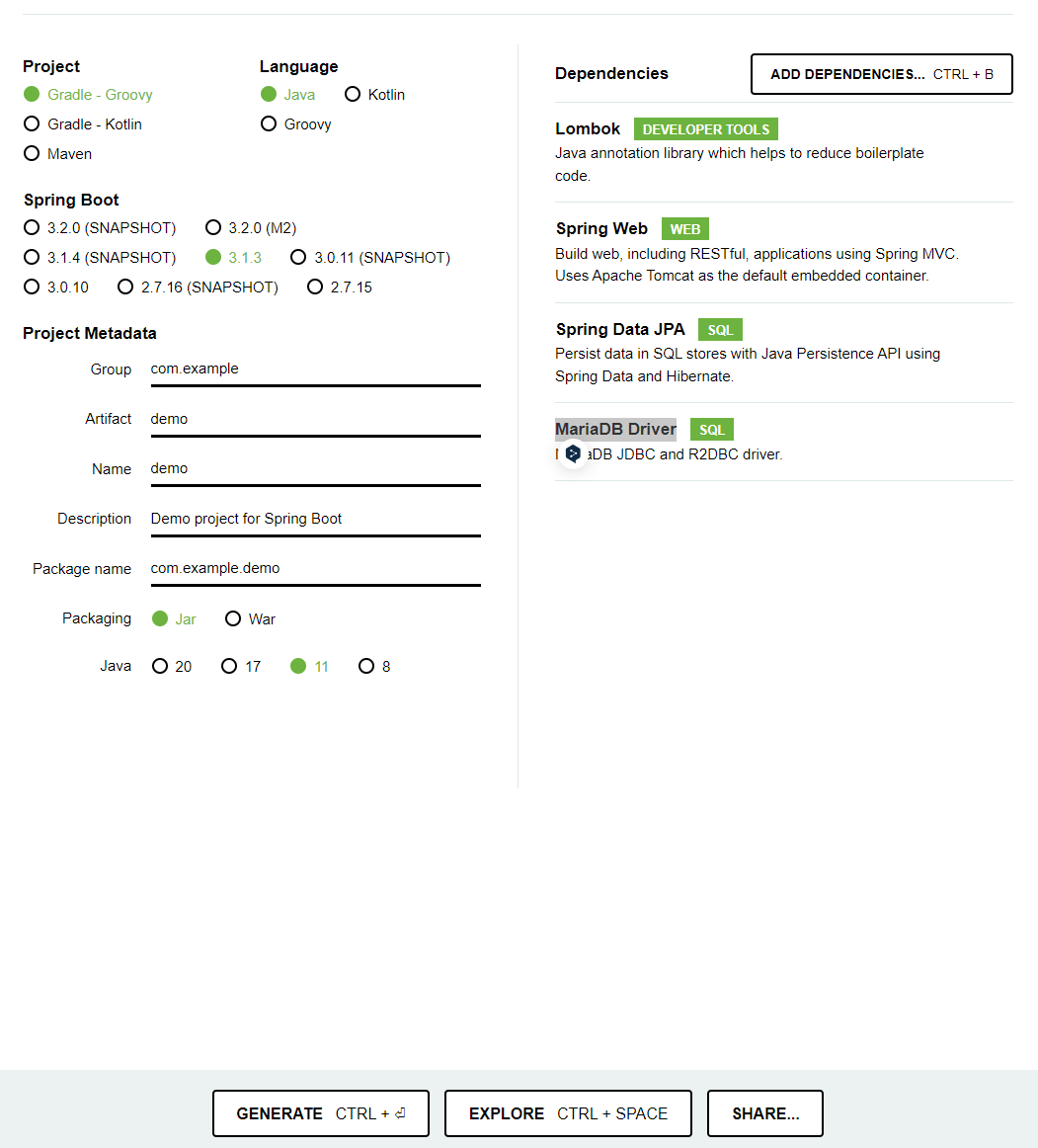 lombok , Spring Web , Spring Data JPA, MariaDB Driver 를 추가하고 GENERATECTRL + ⏎