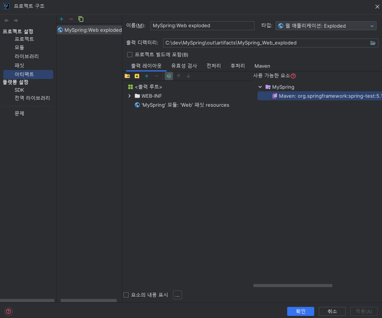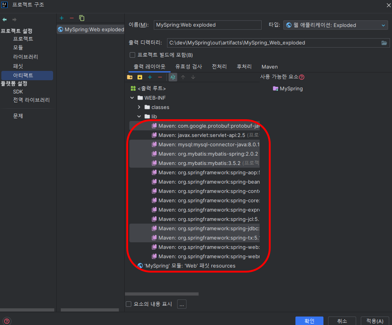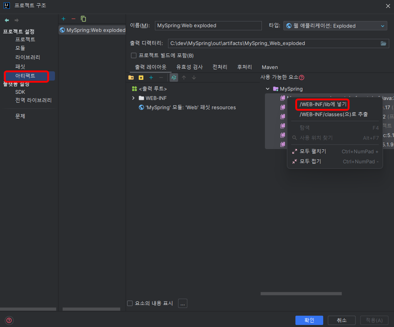 하고나서 프로젝트 스트럭처 Ctrl + Alt + Shift + S 버튼을 눌러서 아키팩트로 들어가 라이브러리를 추가해줍니다