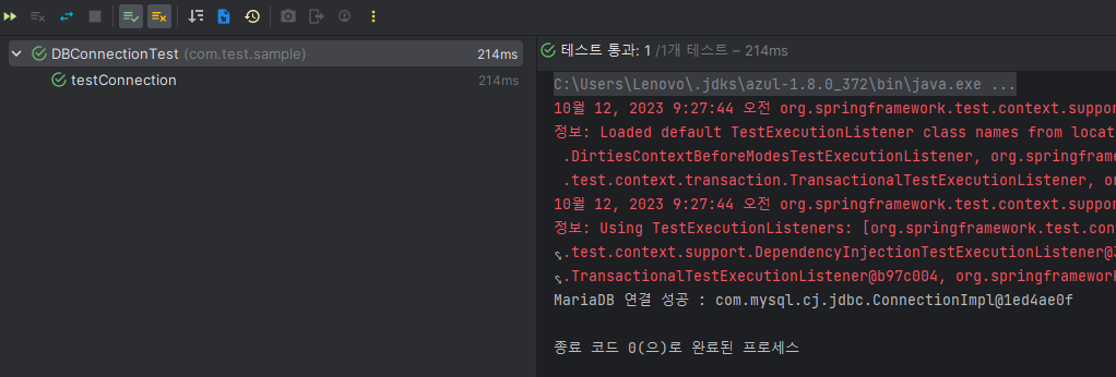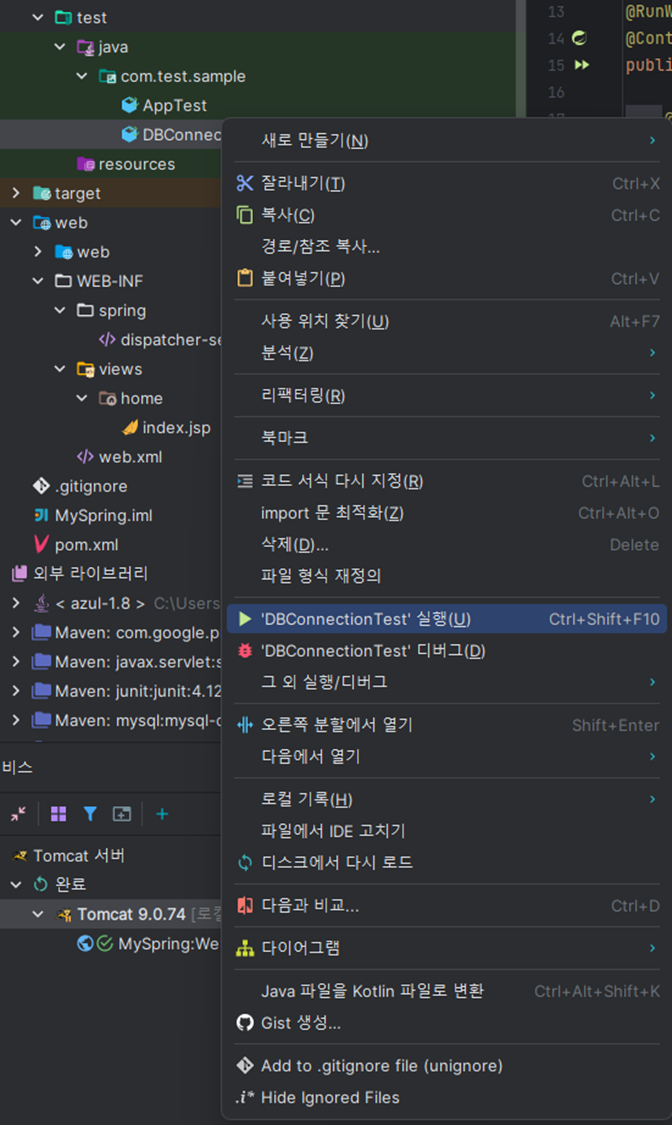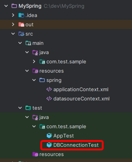 위 그림과 같은 경로에 DBConnectionTest 클래스를 만들어주고