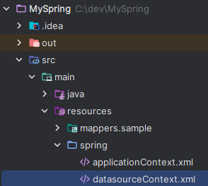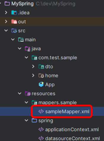 그림과 같은 경로에 sampleMapper.xml을 만들어준다. (mapper/sample/sampleMapper.xml)