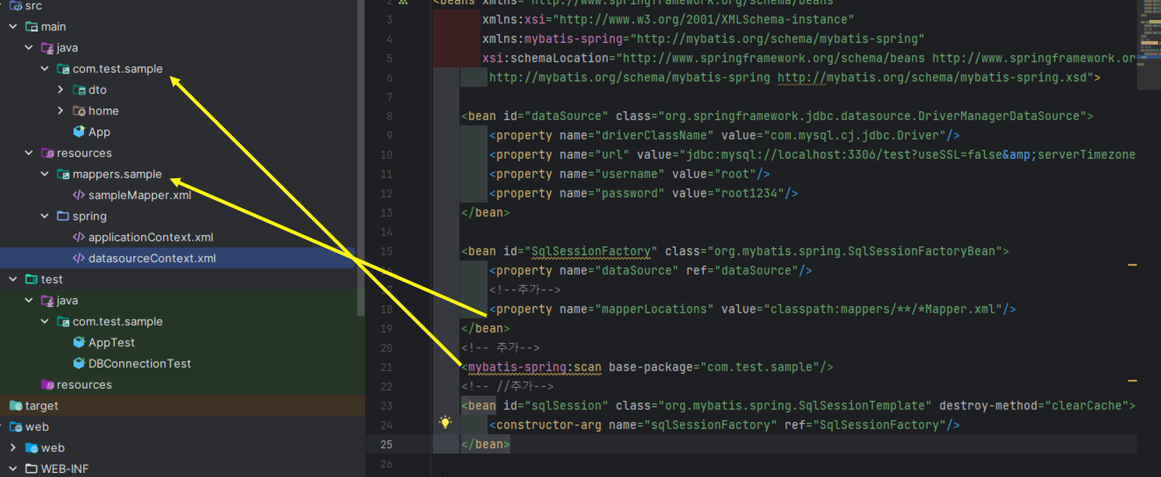 자바단 Mapper를 스캔하려면 com.test.sample패키지를 확인하라는 뜻으로 이해하면 된다.