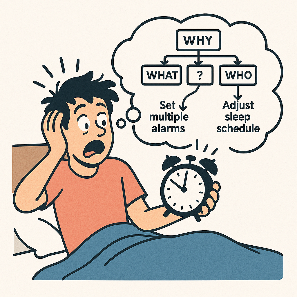 Why: 왜 늦게 일어날까? → 밤에 늦게 자서, 알람 소리가 작아서, 침대가 너무 편해서...