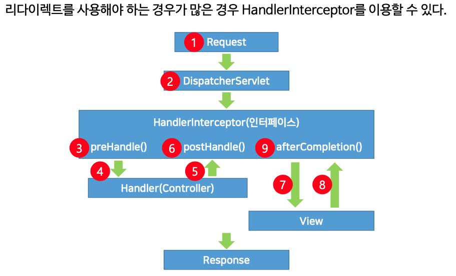 리다이렉트를 자주 사용하지 않는다면 컨트롤러에서 리다이렉트를 해주면 좋으나 공통된 구분이 많을땐 인터셉터를 사용한다고 한다.