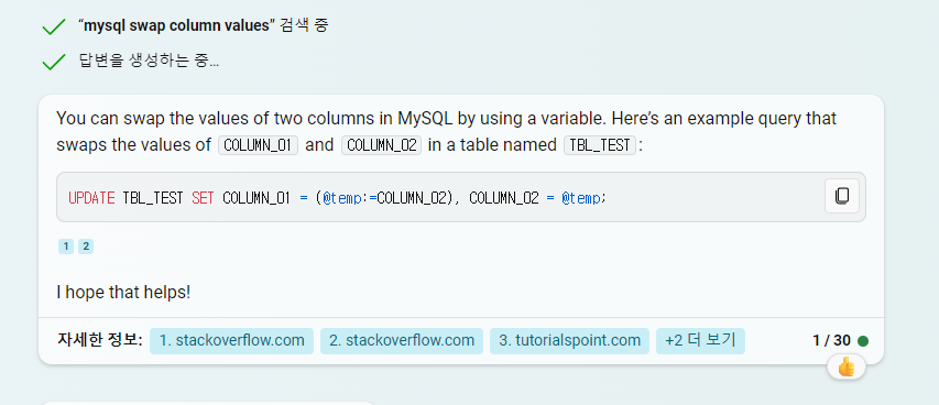 UPDATE TBL_TEST SET COLUMN_01 = (@temp:=COLUMN_02), COLUMN_02 = @temp WHERE COLUMN > 0;